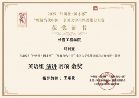 由教育部高等教育司指导、吉林省教育厅主办的2025“外研社·国才杯”“理解当代中国”外语能力大赛之吉林省赛区决赛,于日前落下帷幕。我校国际学生玛利亚凭借出色表现,在竞争激烈的英语组演讲赛项中脱颖而出,荣获吉林省赛区全校一等奖。